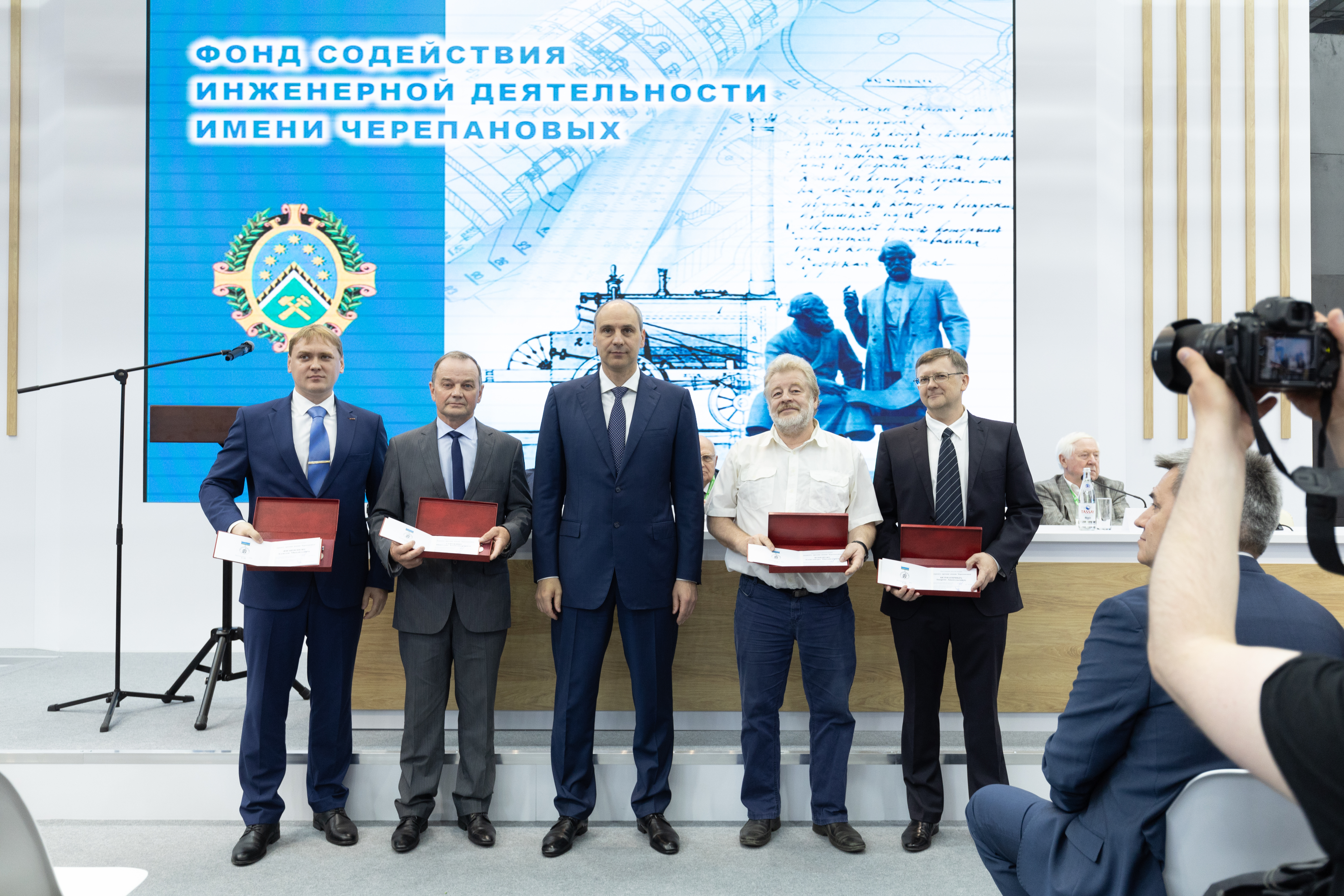 На стенде Правительства Свердловской области премию получали (слева направо): Сорокин Николай Александрович – директор по производству АО НПП «Машпром»; Филимонов Алексей Михайлович – заместитель главного конструктора АО НПП «Машпром»; Комаров Александр Михайлович – главный инженер проектов по металлургическому оборудованию АО НПП «Машпром»; Безматерных Андрей Анатольевич – ведущий инженер-конструктор АО НПП «Машпром».